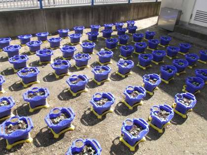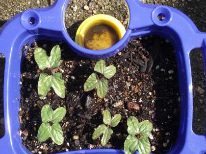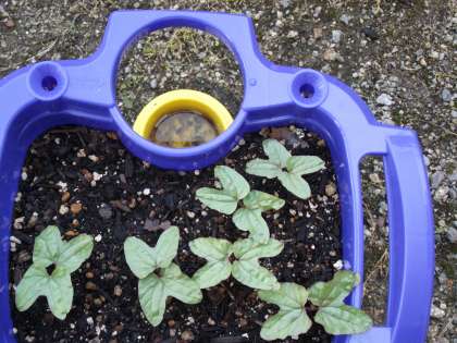 1年生が育てている「アサガオ」の鉢は、二葉や本葉でいっぱいでした。