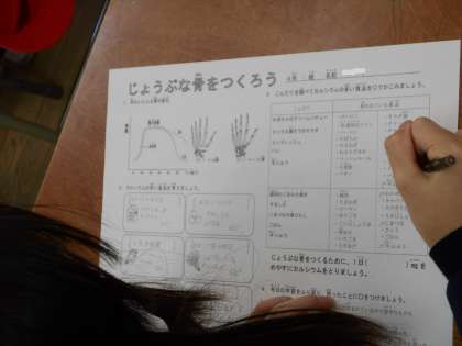 じょうぶな骨をつくるには、カルシウムが大切だとわかりました。ワークシートも丁寧に仕上げました。