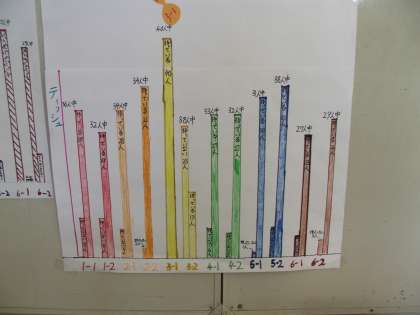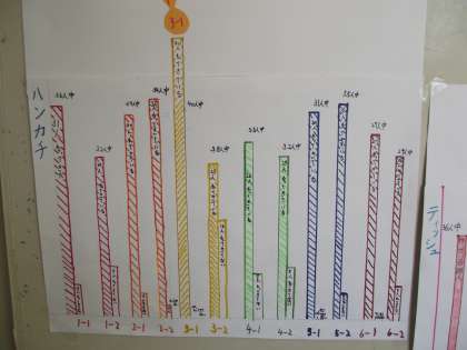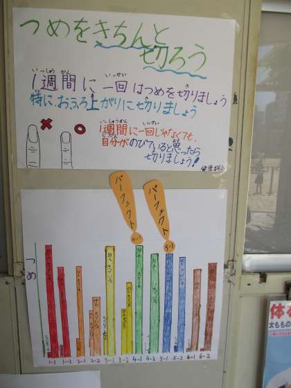 「健康委員会」のメンバー(5,6年生児童)が各クラスに入って、爪切りの状態やハンカチ・ティッシュの携行状況について調査しました。結果は保健室前に掲示しています。