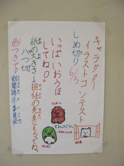 「新聞委員会」メンバー(5,6年児童)は、本日の児童集会で『キャラクターイラストコンテスト』を今年も実施すると、全校児童に告知しました。
