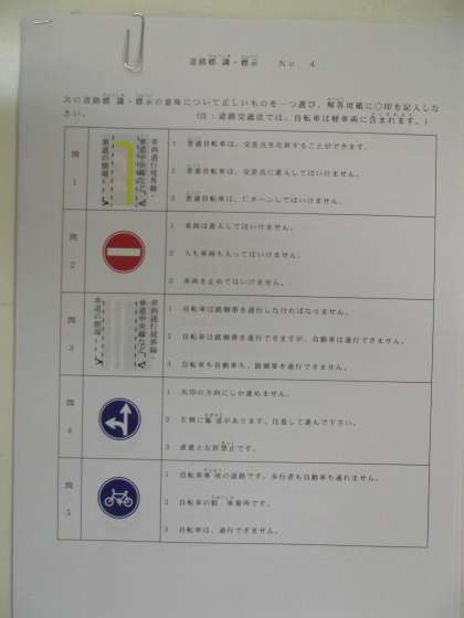 6月27日(土)に行わる小学生「大阪府自転車安全運転大会」(守口体育館)にむけて、城東区(城東警察管内)を代表して聖賢小学校の子どもたちが毎年出場しています。実技試験(細道〔15cm〕,スラローム,障害物等)は、出場チームでさほど差は出ないのですが、やはり学科です。写真は、城東警察の方に指導を受ける小学生と問題例です。