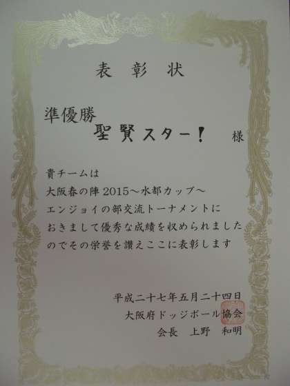 昨日、舞洲で開催された大阪府のドッジボール大会で本校5年生チーム『聖賢スター!』が、大阪春の陣 2015〜水都カップ〜エンジョイの部 交流トーナメント部門で“準優勝”しました。