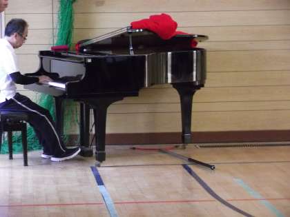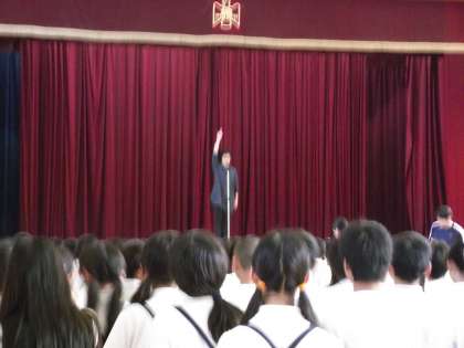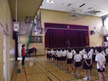 今朝の児童朝会は、歌う姿勢やタイミングを覚えたあと、「運動会の歌」や「聖賢小学校歌」を歌って練習しました。