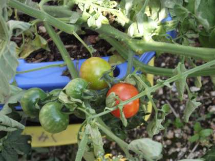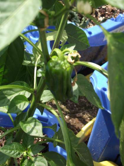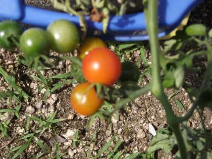 ミニトマトが、少し赤くなってました。もうすぐ食べられるかな?ピーマンも形になってます。