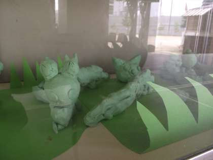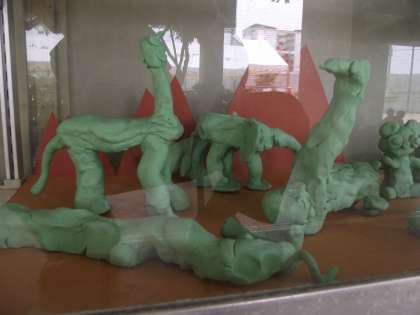 1年生が粘土でこしらえた「動物」さんです。職員室前のガラスケースでお待ちしてます。