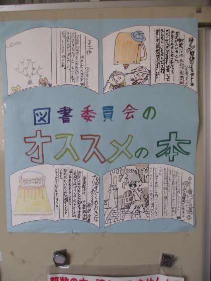 図書委員会メンバーが、「おすすめ本」を図書室前に掲示しています。また、6月11日は「学校図書館の日」とのことです。