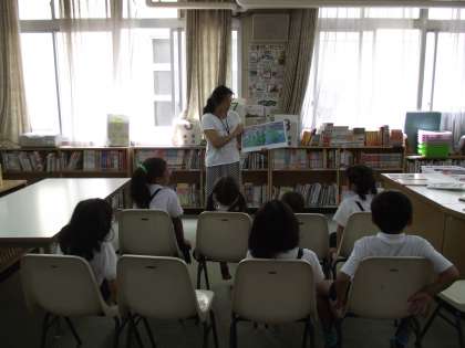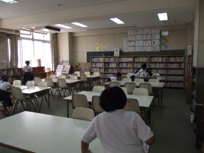 今日は、水曜日。お昼は図書ボランティアさんによるいつもの「読み聞かせ」や本の整理、修復等の活動が行われました。