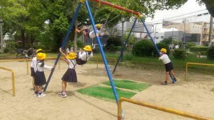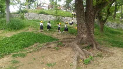 鬼ごっこをする子、ぶらんこやすべり台で遊ぶ子、お花や松ぼっくりを見つける子、