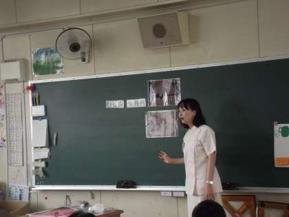 専門の先生に来ていただいて、6年生が「歯と口の健康教室」で、虫歯や歯周病について学習しました。歯磨きの実習もしました。