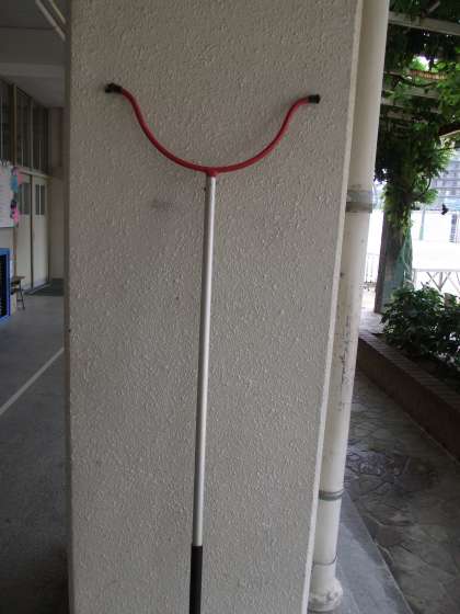 今日は「不審者侵入」の避難訓練をしました。実施は子どもたちに伝えていましたが、開始時刻は秘密でした。で、休憩(休み)時間に実施したので、子どもたちも少しびっくりしたようです。地震にしろ火事にしろ、いつ起こるかわからないので、いろんな想定のもとで訓練します。写真は「さすまた」と「鍵がかかっている玄関」です。