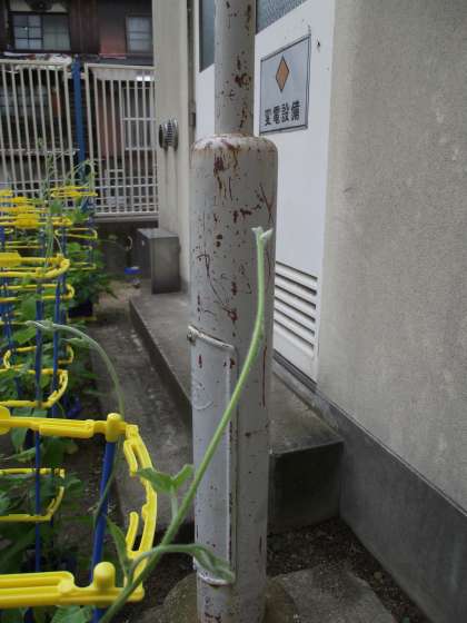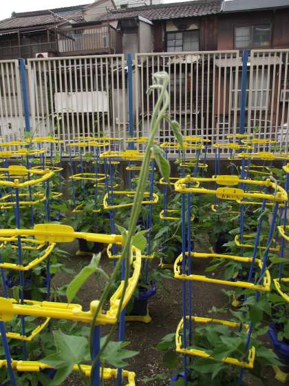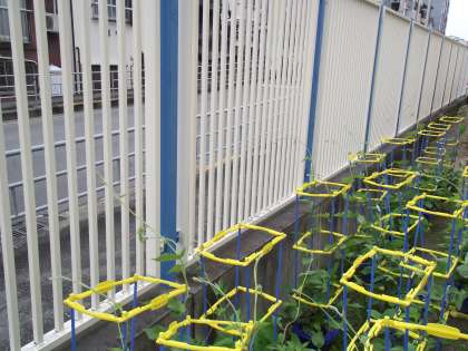 蔓は順調にのびています。となりの鉄柱に巻きつくのか、学校のフェンスに巻きついていくのか、あるいはとなりの子の支柱からまたとなりの子の支柱へと延々巻きつくのか。さあ、子どもたちがどう判断して対処するか楽しみです。