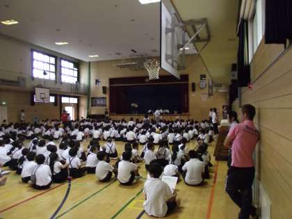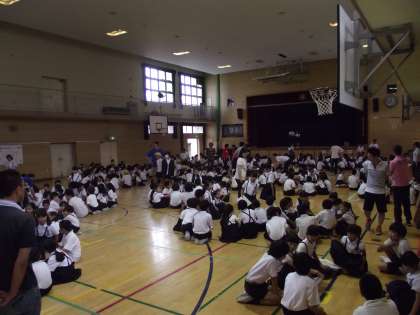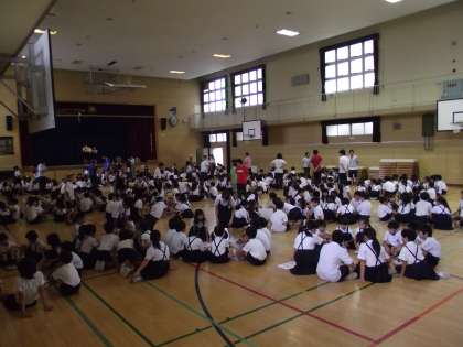 今日の集会活動は「名前当てゲーム」です。各縦割り班毎に輪になって、班の子の名前を全員(大体15人)覚えて声に出して言うゲームです。