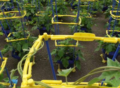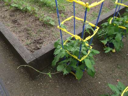 自分の支柱に巻きついて行く蔓、どこに行こうか彷徨っている蔓、行方が楽しみです。