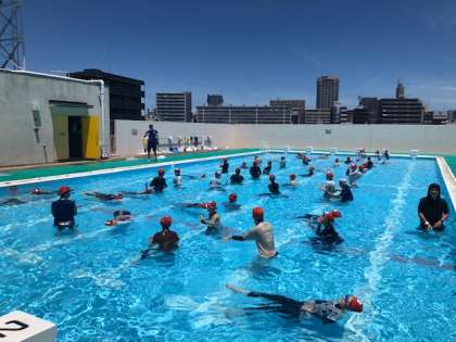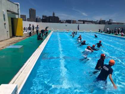 服を着た状態で水に入り、水着よりも動きにくい感覚を体験しました。