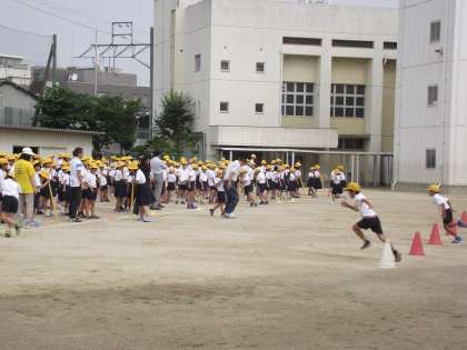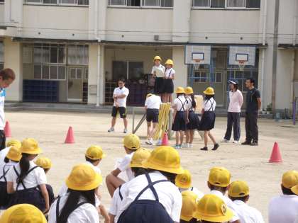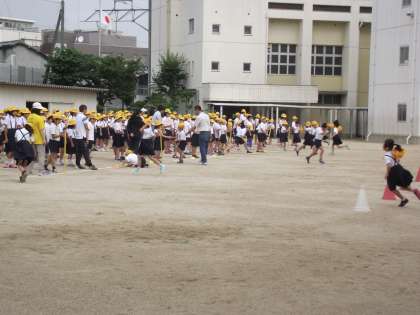 今日の児童集会は、まず棒に額を当てて3回まわり、コーンまでダッシュして次の人にタッチするリレーでした。集会委員が、見本を見せました。