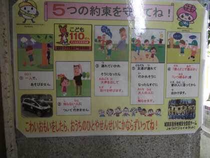 1.一人で遊びません。2.知らない人についていきません。3.連れていかれそうになったら、大声を出して助けを呼びます。4.友達が連れて行かれそうになったら、すぐ大人の人に知らせます。5.「誰とどこで遊ぶか」「いつ帰るか」を家の人に言ってから出かけます。