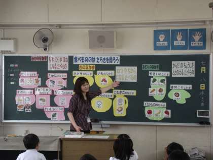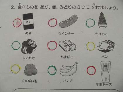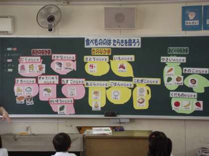 2年生は「食べものの はたらきを知ろう」のテーマで学習しました。若干1年生の復習も交えて赤黄緑に食品を分類していきます。子どもたちが迷ったのは、「マヨネーズ」。卵よりも油が強いので黄色の仲間でした。