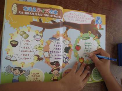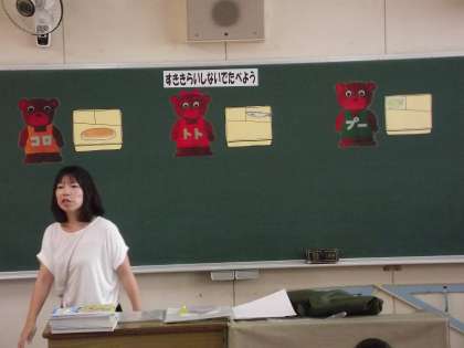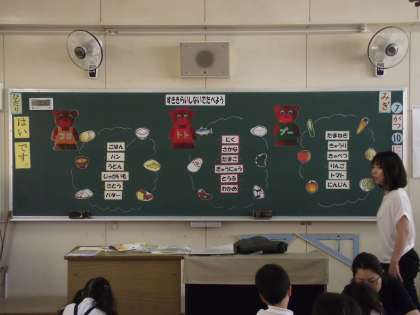 「すききらい しないで たべよう」がテーマです。最初に子ども達に苦手な食べ物を聞いたら、「海藻」「茄子」「ピーマン」「ゴーヤ」「豆」「蕪」「ズッキーニ」「ご飯」「肉」「梅干し」と結構いろんな種類が出てきました。食品、食材名は、割と知っているようでした。