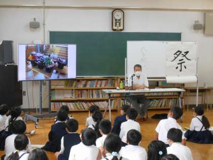 聖賢地域の「蒲生若宮だんじり」について、若宮八幡大神宮の榊原宮司に話を聞きました。児童はしっかりメモを取りながら、学習しました。