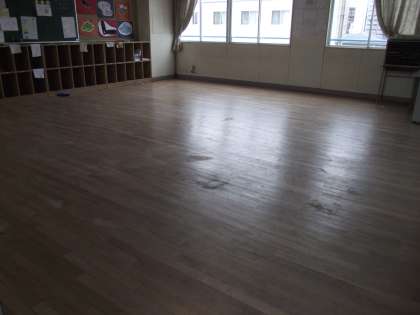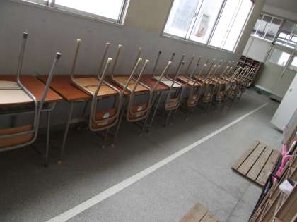 教室の「ワックスがけ」をする時、こんな感じで机椅子を廊下にだしてから、ワックスをかけます。