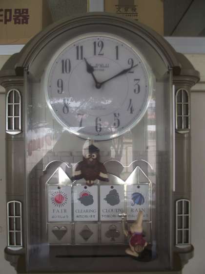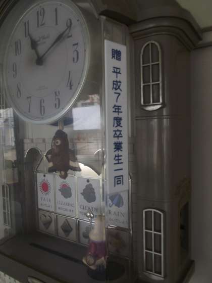職員室前廊下にかかっている時計は、平成7年度卒業生の皆さんからです。天気予報をしてくれます。各△時00分の時にはファンファーレが鳴る時もあります。