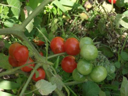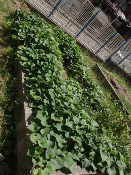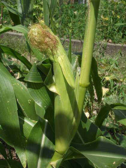 さつまいもの葉が、花壇から溢れそうです。トウモロコシもそろそろかな?