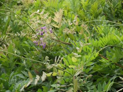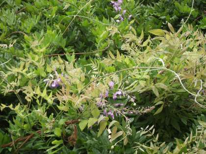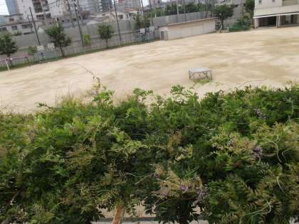 サウナのような校舎2階廊下を歩いていると、窓下に何やら「花」のような紫色の者が目に入りました。立ち止まって窓を開けると、藤の花でした。