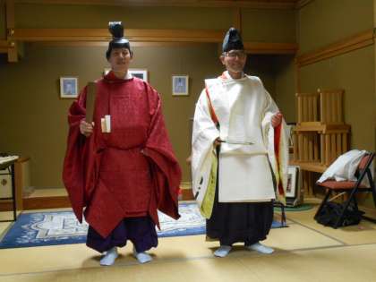 若宮八幡大神宮の宮司さんから、「衣冠束帯(いかんそくたい)」について教えていただきました。衣冠束帯とは貴族の礼装にのことで、本校の教員が実際に着てみました。