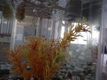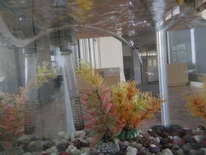 透明水槽のメダカさんは元気でした。若干数が減ったような気がしますが…。水槽の掃除や世話は、すべて学級の皆さん(子どものみ)で行なっているとのことです。メダカさんが撮影できたかどうかよくわからないのですが…。