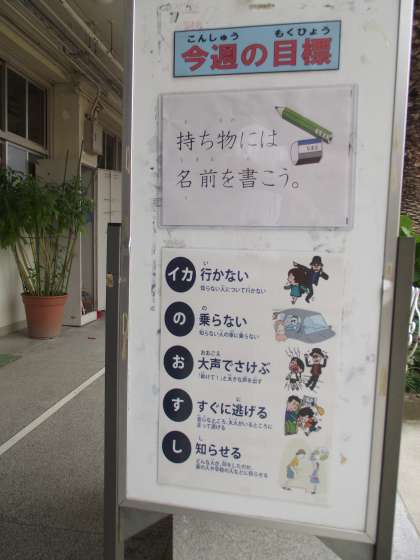 「持ち物には、名前を書こう」です。物を大切にする気持ちが育つよう願うばかりです。『イカのおすし』も宜しくお願いいたします。