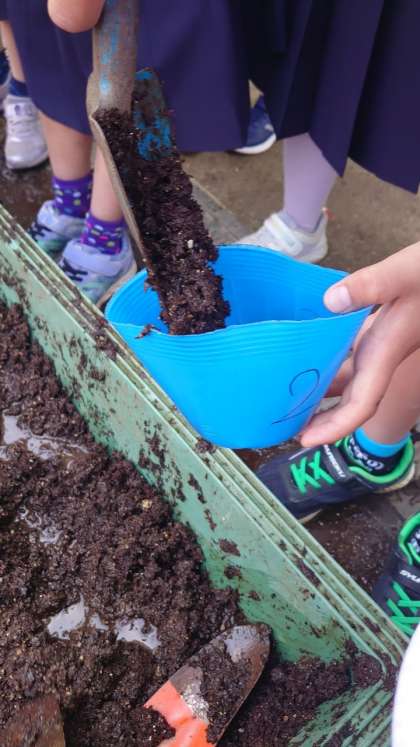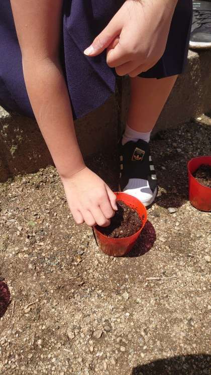 三年生から始まる教科、理科、楽しく学びましょう。3年生で育てる植物は、ひまわり(ポット黄)、ホウセンカ(ポット赤)、マリーゴールド(ポット青)。ポットにたねをまきました。土はそれぞれの植物に合ったものをつくり、ポットに児童自らが入れて、たねをまきました。みんなで水やりをして、どんどん成長させて観察していきましょう!