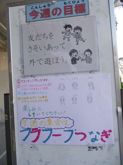 「友だちを誘いあって、外で遊ぼう」です。今週の『児童集会』は『フラフープつなぎ』と。集会委員会のメンバーが宣伝してました。流石。