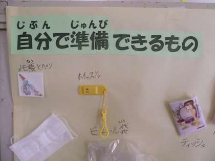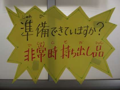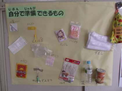 保健室前に「非常持出」の例が提案されました。いつくるかわからない災害に備えたいものです。