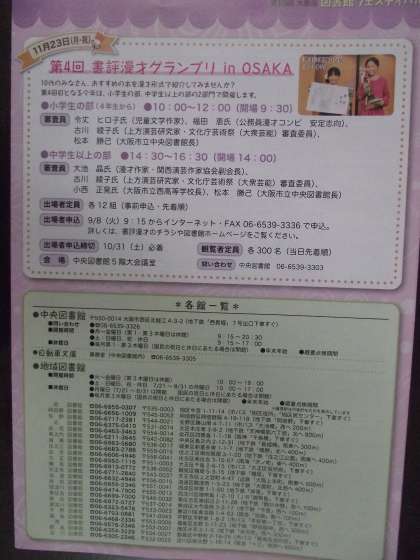 他にも、「文楽よもやま話」「小説を書いてみよう」「朗読会(ハンブルクの作家)」「書評漫才グランプリ」等。詳しくは、チラシか、大阪市中央図書館HPまで。