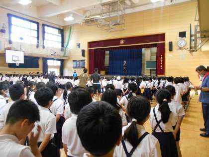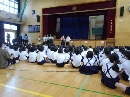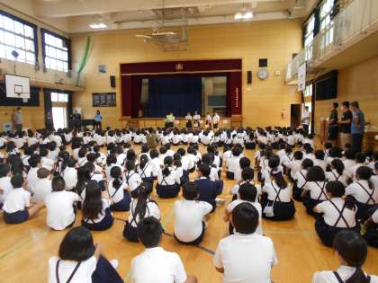 平和集会を行いました。6年生が全校生に京橋空襲を中心に、戦争について調べたことを発表しました。ピースおおさかも見学し、平和について考えたことを伝えました。「青い空は」を歌い、集会を終えました。