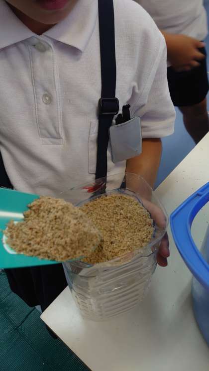 土、砂、じゃりのつぶの大きさを手ざわりや虫眼鏡で見てくらべた後、ペットボトルで写真のような装置をつくります。土、砂、じゃりを入れた後、同じ量の水を同時に注いで、水のしみこむ様子を比べました。