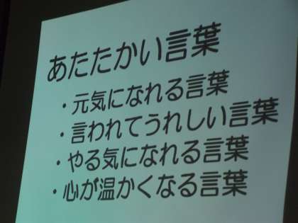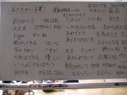 「ありがとう」「がんばれ」「大丈夫」「できたら1万円」「楽しい」「ファイト」「○○やったら、いける」「君ならできる」「おめでとう」「あと、もうひといき」「うまいなあ」「いいね」「すてき」「やればできる」「次からがんばれ」「元気出して」「一緒にあそぼ」「ずっと友達」「頼りになる」「自分を信じろ」「助かる」「さすが」「天才」「字が綺麗」「優しい」「一緒に頑張ろう」「諦めないで」「勇気を出して」「頭いいね」「めげるな」「上手だね」「かわいい」「きっとできる」「おもしろい」「応援してる」「力持ち」「またあした」「勝ちぬけ」「いけめん」「ばいばい」「ハッピーバースディ」「まだまだできる」「最高」「気をつけてね」「友達になろう」「友達いっぱいだね」「その調子」などでした。
