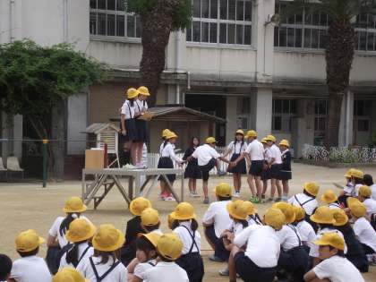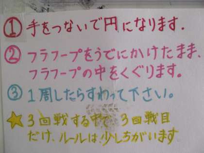やっと、フラフープのゲームができました。まずは、集会委員会のメンバーが見本を示して、ゲームを始めました。