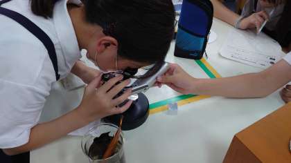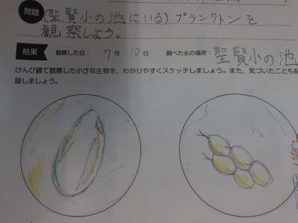 池の水を、目の細かいあみで何回もすくい、ビーカーの水の中に洗い出します。その水を光にすかして動くものがいるかを確認。スポイトで水を一滴とり、プランクトンプレパラートを作って顕微鏡で観察しました。