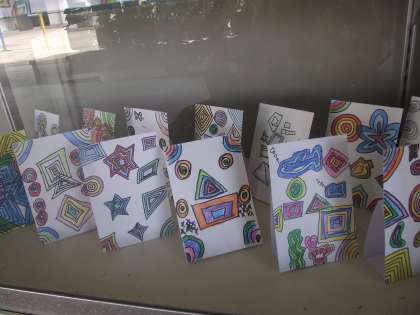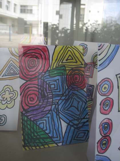 職員室前ガラスケース展示作品も新しくなりました。幾何学的というか、抽象的というのか……。