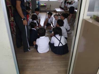 9日(金)は、全校オリエンテーリング。2時間目に、グループ(縦割りの異年齢集団)毎に集まって、どういう順でポイントを回るとか、さまざまな作戦を考えました。