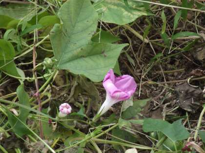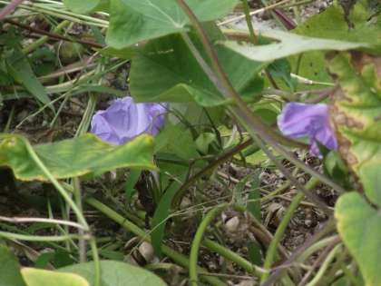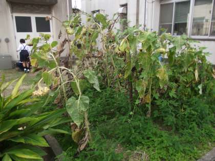 アサガオは元気です。横で小さい女の子たちが移植ごてで、土に穴を掘ってました。何してるのと聞いたら、えへへへと笑ってました。