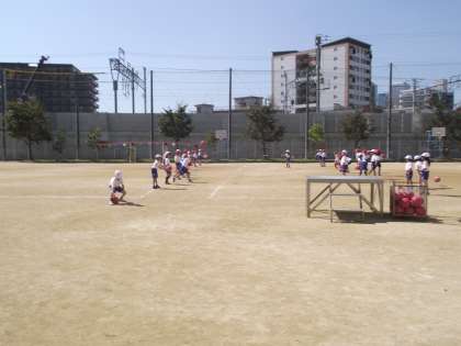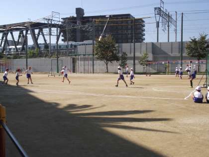 小さい学年は、向かい合ってボールをキャッチしていました。少し大きい学年は、ハンドボールのような、ポートボールのようなゲームを楽しんでいました。