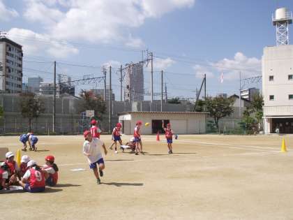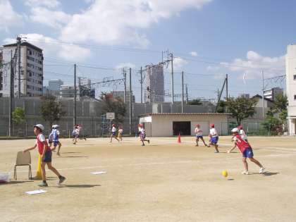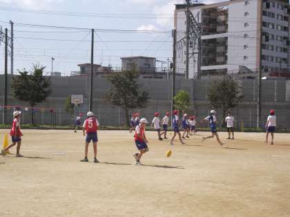 大きい学年の子が、楕円形のボールを走りながらパスしたりキャッチしたりする練習をしていました。ラグビーではないので、前や横にパスします。結構迫力ありました。