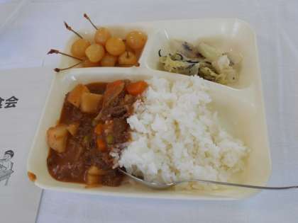 メニューはハヤシライス、キャベツのひじきドレッシング、さくらんぼ、牛乳です。結構な分量に驚かれていました。