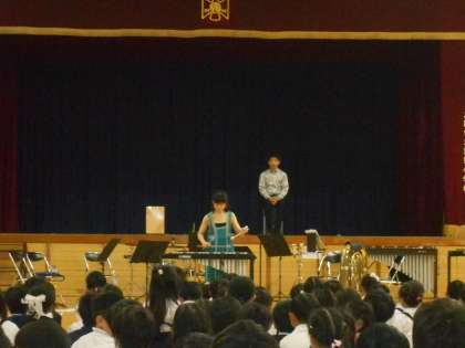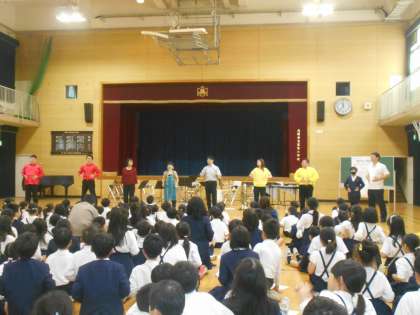 2日(木)に「ひゅ〜ぶらすクインテットと仲間たち」(金管五重奏)による、音楽鑑賞会が行われました。音楽室にある楽器を使っての演奏では、「わぁ〜」と驚かされた様子。「アニメの歌」「となりのトトロ」のメドレーでは、児童もノリノリでした。みんなで手拍子でリズムあそびを体験しました。