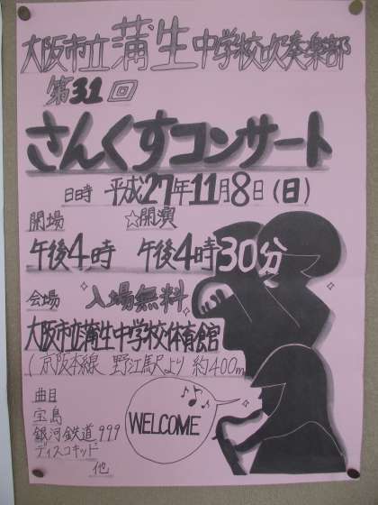 11月8日(日)16時30分より、蒲生中学校体育館で、吹奏楽部のコンサートが開催されます(入場無料)。ちなみに15時まで、聖賢小学校で「ファミリ−運動会」を開催しています。