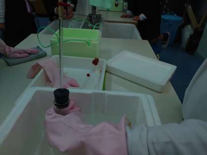 温度による空気の体積変化を調べました。ガラス管つきゴム栓(管部)にゼリーをさし、真上に引き上げ、丸底フラスコにはめて、フラスコを湯につけて温めたり、氷水につけて冷やしたりします。