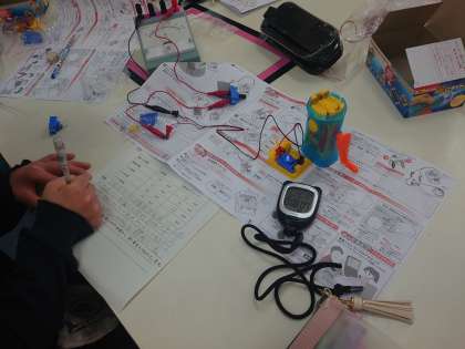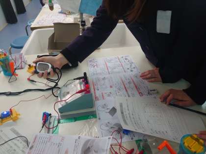 3年生から毎年学んできた電気分野。6年では発電と共に蓄電についても学びます。コンデンサーと手回し発電機をつなぎ、ハンドルを一定の速さで回し、コンデンサーに電気を蓄えます。この蓄えられた電気で、豆電球や発光ダイオードはどのように光るのか?コンデンサーを含む回路に流れる電流の大きさも、電流計を使って調べます。