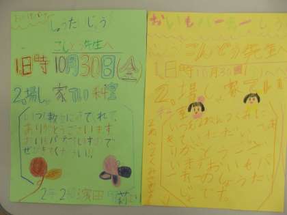 「招待状」も多くの職員が当日いただきました。甘くておいしいお芋でした。放課後、数人の2年女子から「ちゃんと、食べましたか?」「おいしかったですか?」と聞かれたので。「ありがとうございました。甘くて、とてもおいしかったです。」と、正直に応えました。